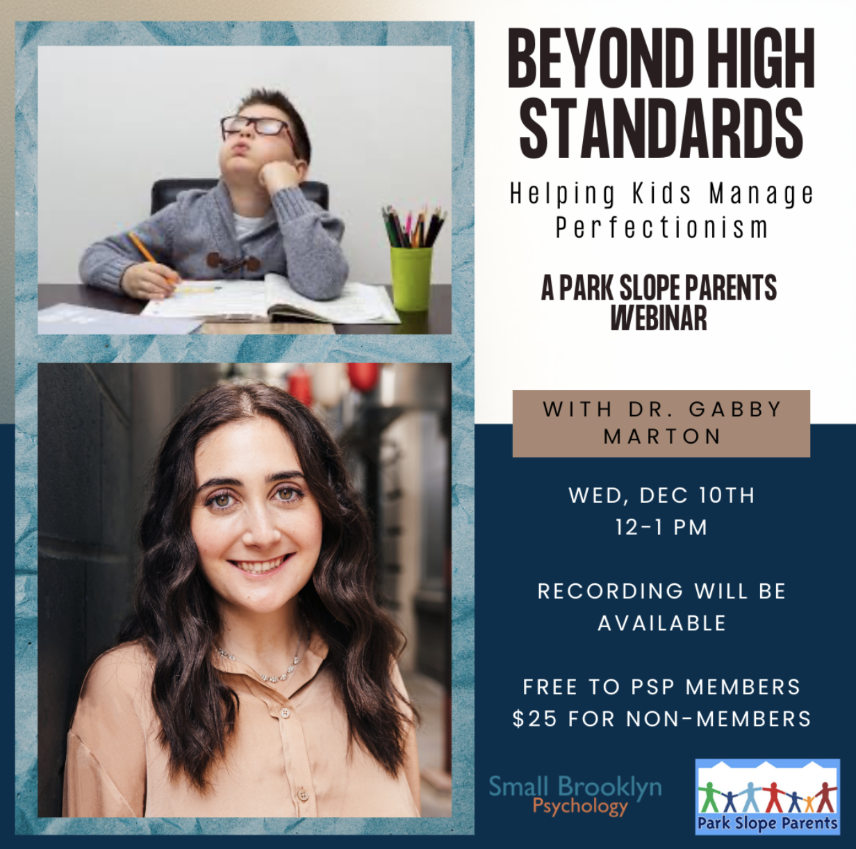In this webinar, Dr. Gabby Marton of Small Brooklyn Psychology will break down how to identify perfectionism in kids and teens and what makes it different from typical motivation. She’ll share evidence-based strategies used by clinicians—including exposure, flexible thinking, and challenging automatic negative thoughts—along with practical guidance for shifting language and habits at home to help break perfectionistic cycles. Dr. Gabby will offer clear principles, real-life examples, and take-home tools so parents can support kids’ resilience, confidence, and healthier expectations. A Q&A session moderated by Dr. Mandi White-Ajmani will follow.