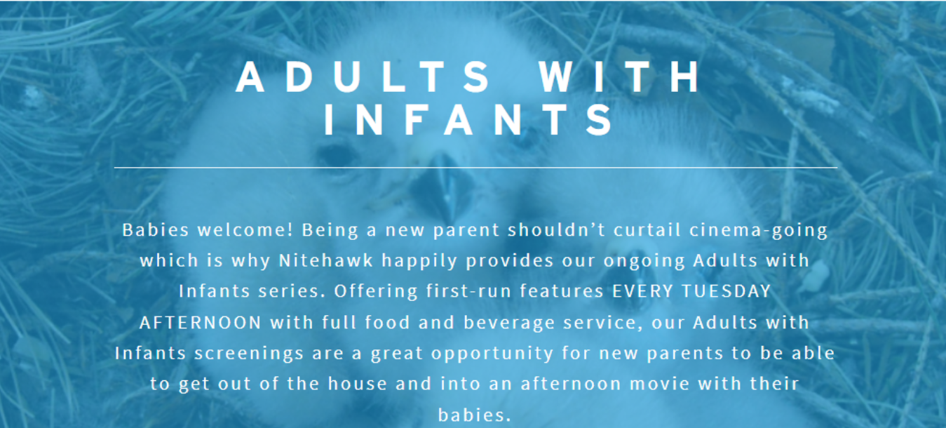 While it's cold outside, meet up with other new parents for a Tuesday movie! Times vary, but both Alamo and Nitehawk have baby-friendly viewings each week. See below for schedules!